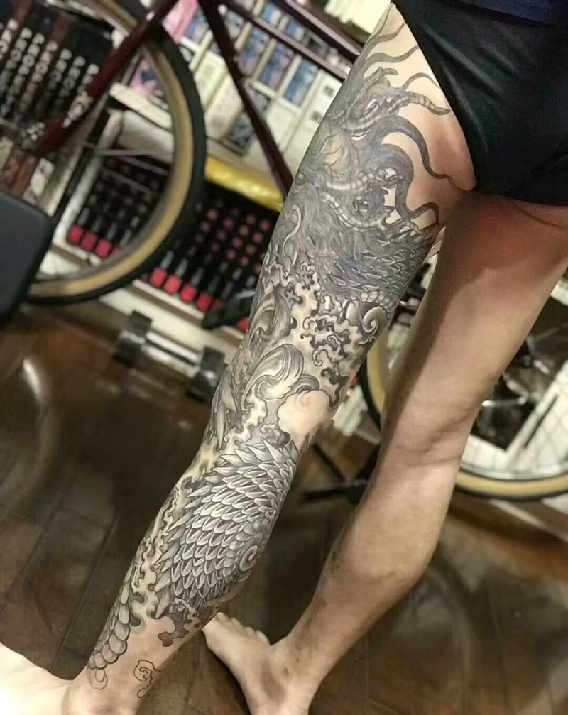 • T网红王老大花腿龙纹身图片_腿部新传统纹身图案