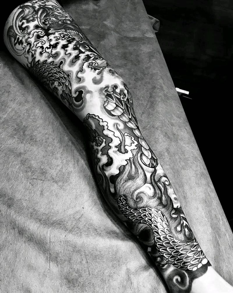 • T网红王老大花腿龙纹身图片_腿部新传统纹身图案