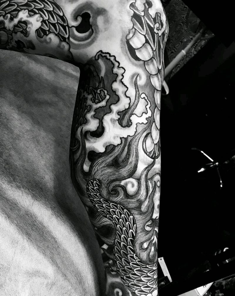 • T网红王老大花腿龙纹身图片_腿部新传统纹身图案