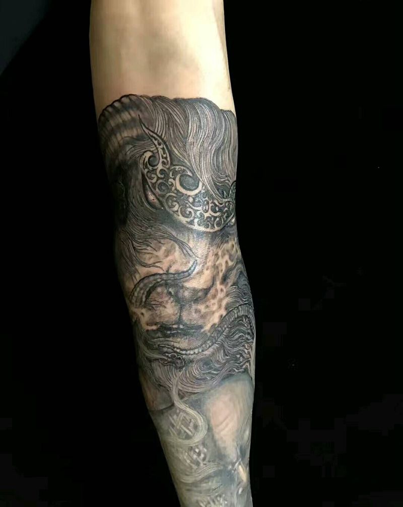 当前位置: 首页 >浙江省宁波市纹身店-惊骇空间纹身图案>羊角与佛首纹身图片_手臂纹身图案