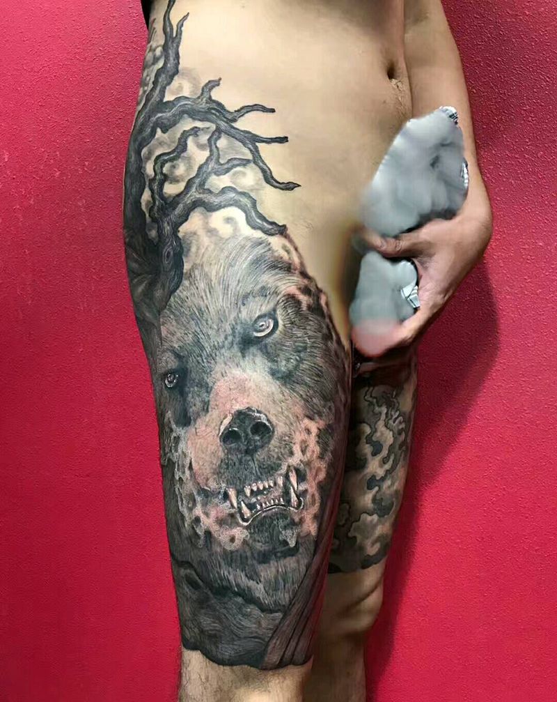 • T网红王老大花腿龙纹身图片_腿部新传统纹身图案