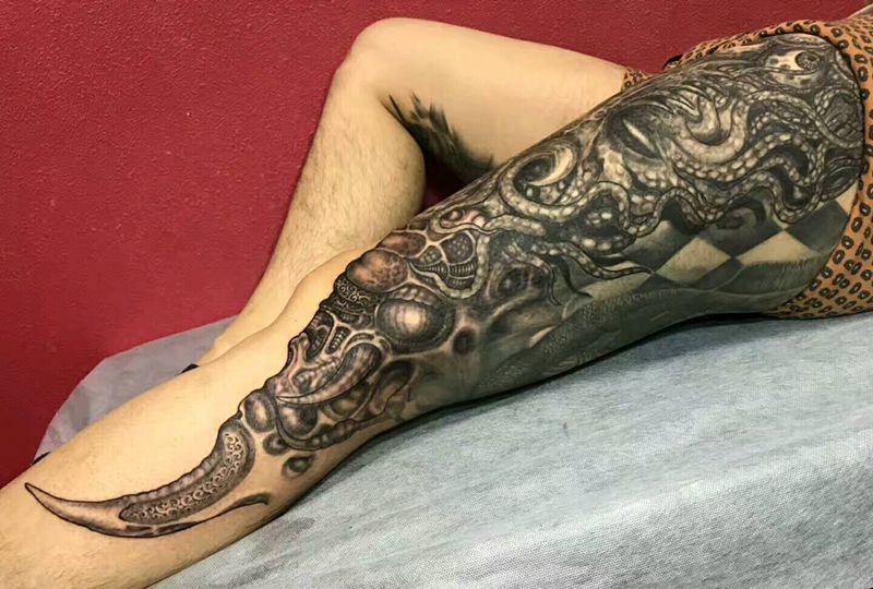 • T网红王老大花腿龙纹身图片_腿部新传统纹身图案