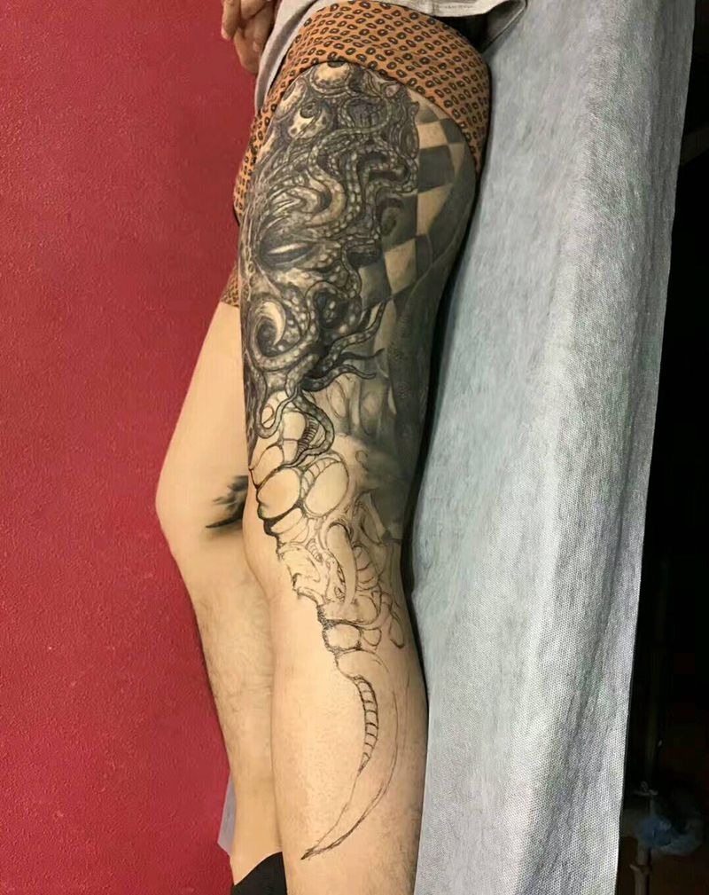 • T网红王老大花腿龙纹身图片_腿部新传统纹身图案