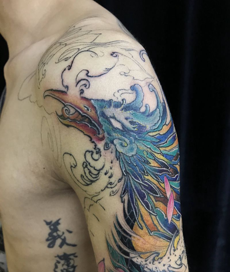 花臂的第一步纹身图片_手臂新传统貔貅凤凰纹身图案