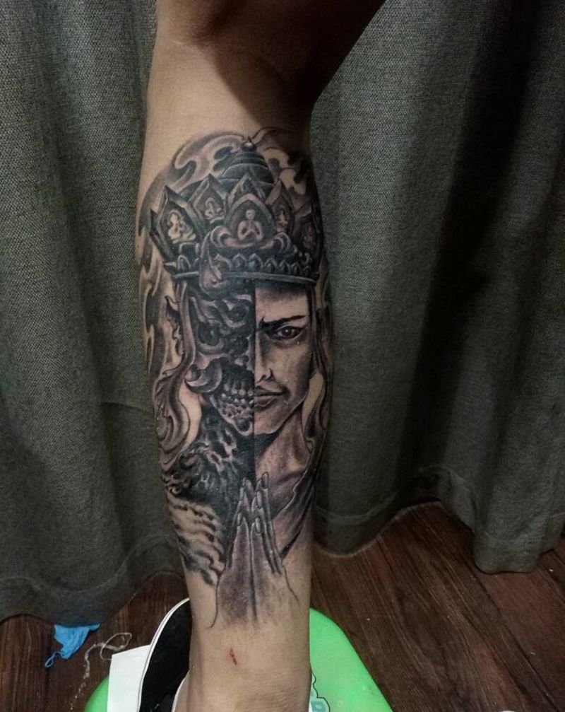 当前位置: 首页 >浙江省宁波市纹身店-名品轩刺青纹身图案>半面佛纹身图片_腿部传统肖像人物鬼神宗教成品纹身图案