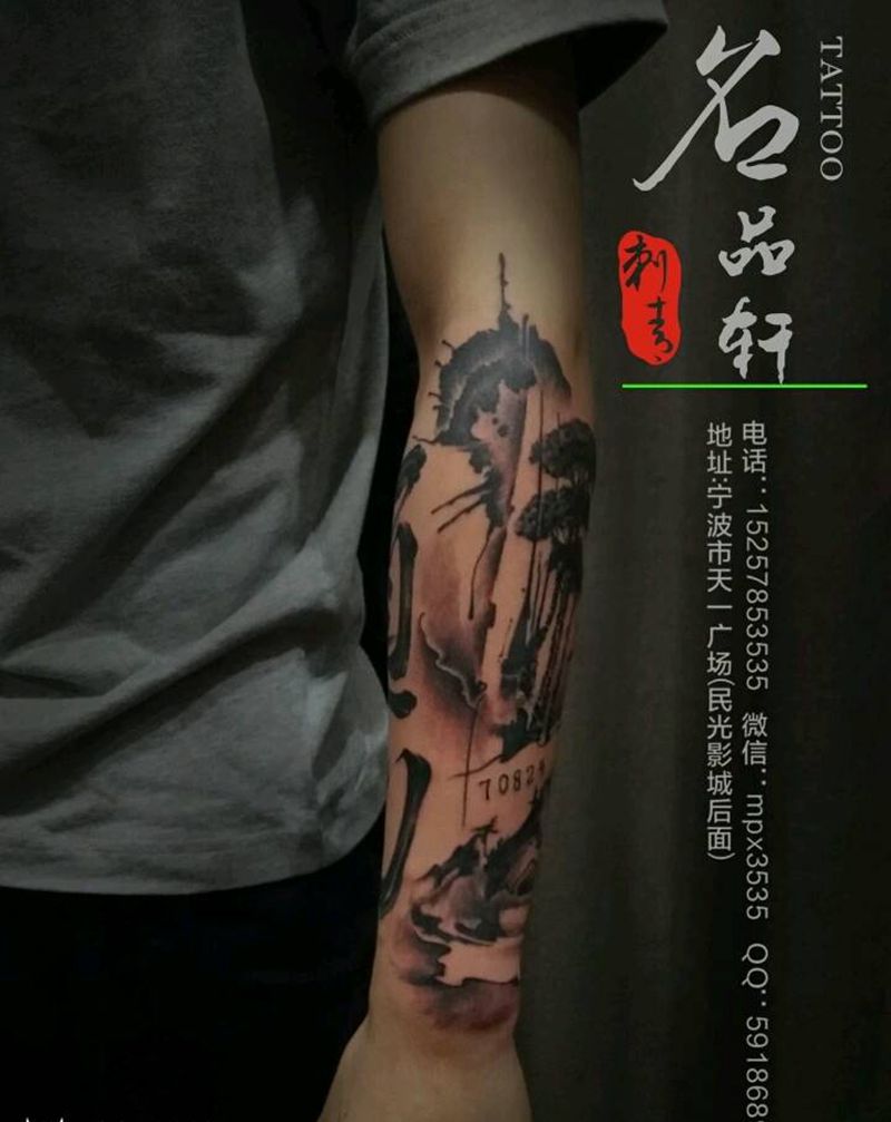 当前位置: 首页 >浙江省宁波市纹身店-名品轩刺青纹身图案>小手臂水墨书法纹身纹身图片