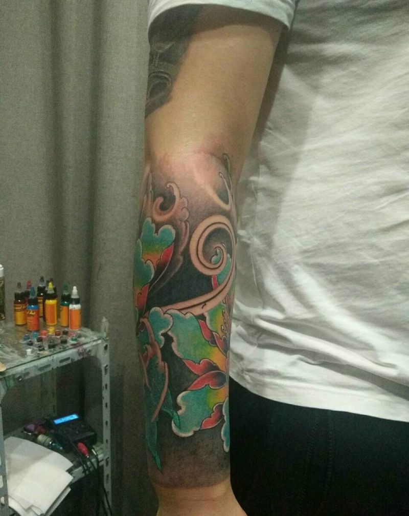 包小臂――牡丹纹身图片_手臂传统植物成品纹身图案