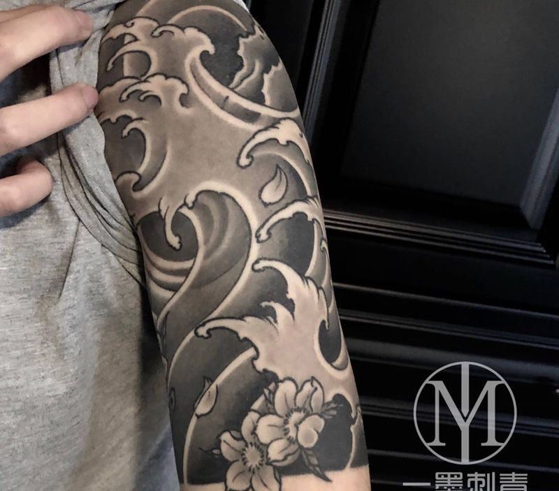 浪臂 恢复后纹身图片_肩部手臂新传统水浪纹身图案