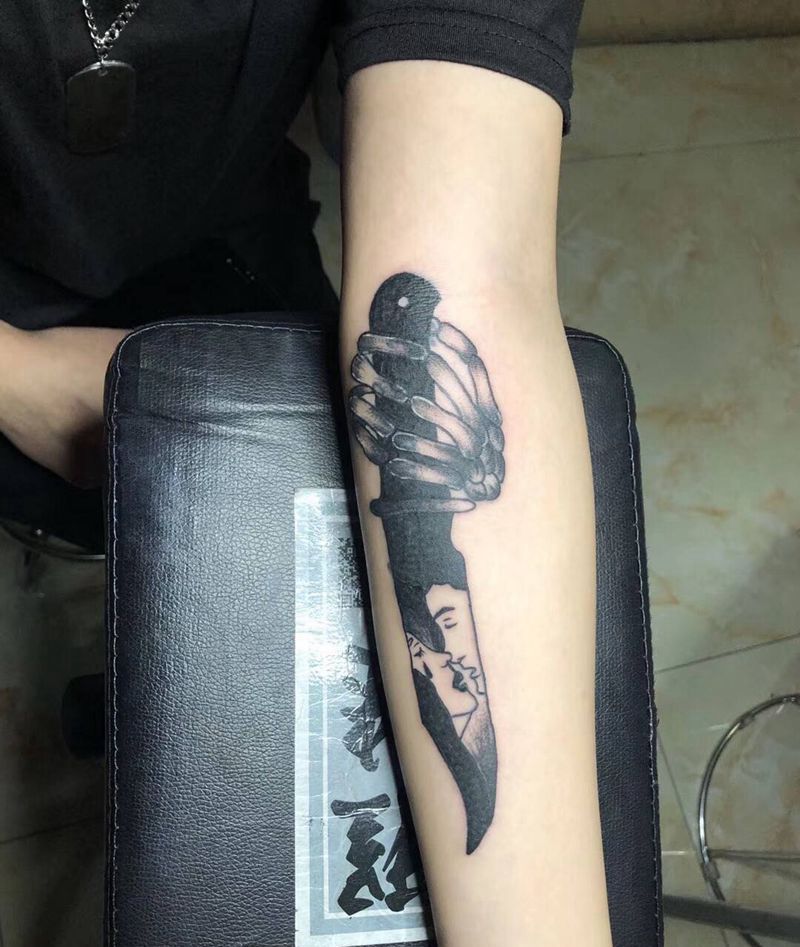 当前位置: 首页 >浙江省宁波市纹身店-程迷刺青纹身图案>匕首遮盖纹身图片_手臂暗黑匕首纹身图案