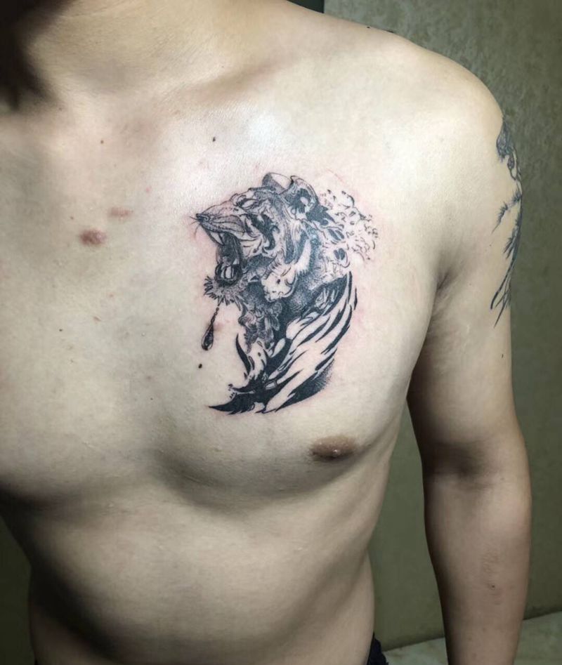 当前位置: 首页 >浙江省宁波市纹身店-程迷刺青纹身图案>老虎头纹身图片_胸部图腾点刺纹身图案
