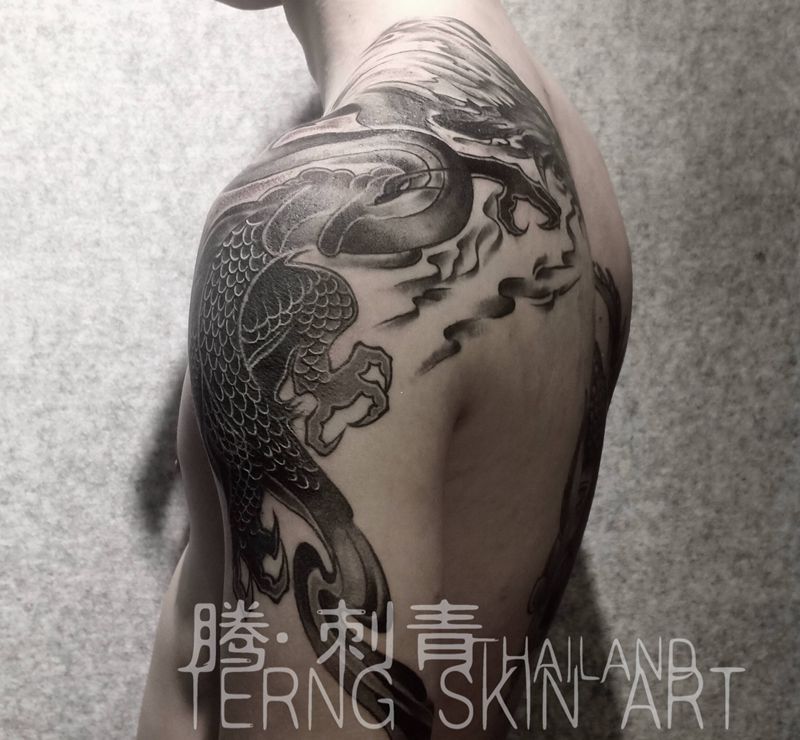 当前位置: 首页 >浙江省宁波市纹身店-腾.刺青纹身图案>另类过肩龙遮盖旧纹身纹身图片_肩部手臂新传统龙遮盖纹身图案