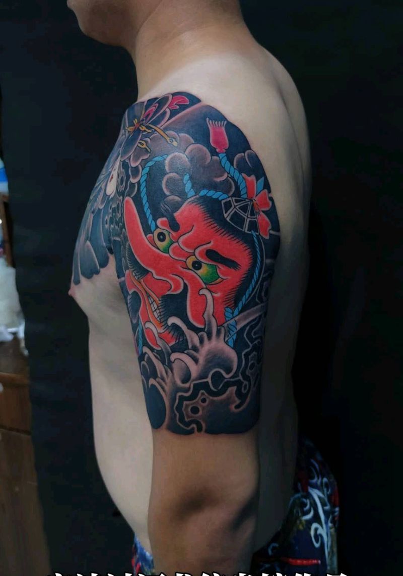 当前位置: 首页 >浙江省宁波市纹身店-过江龙纹身馆纹身图案>天狗半甲纹身图片_肩部手臂新传统天狗艺伎纹身图案