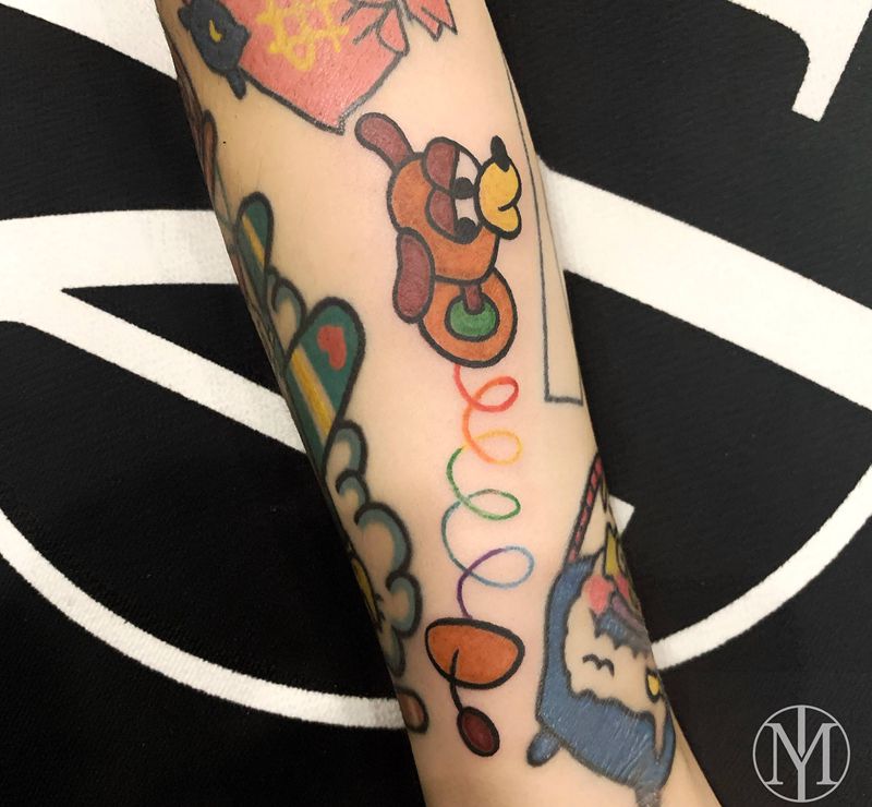 当前位置: 首页 >浙江省宁波市纹身店-一墨刺青纹身图案>卡通弹簧狗纹身图片_手臂New School纹身图案