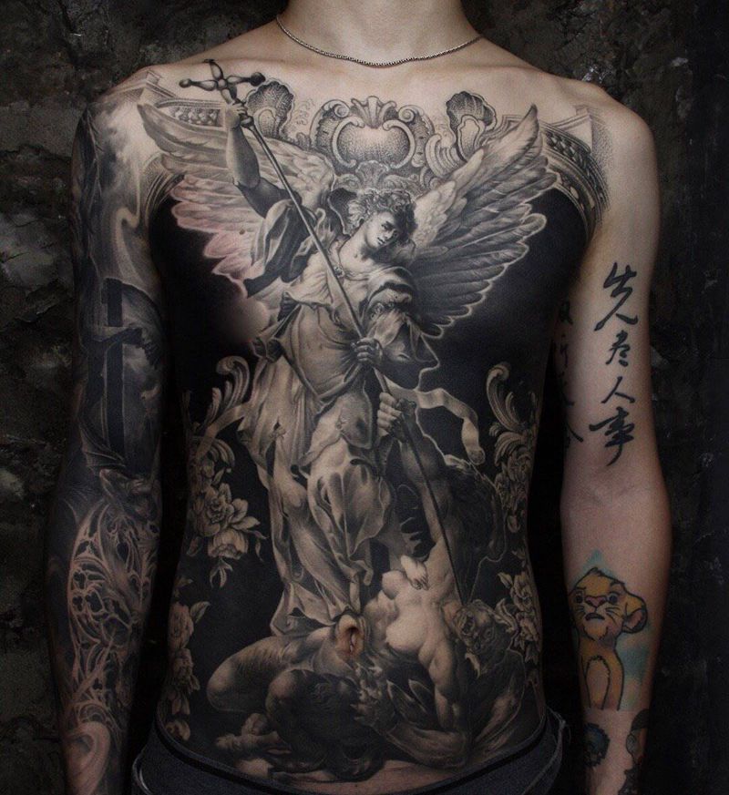 天使与恶魔纹身图片_胸部欧美写实纹身图案