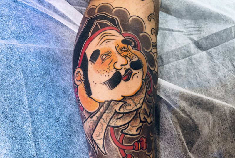 • T包小腿吹火男+阿多福纹身图片_腿部老传统新传统吹火男阿