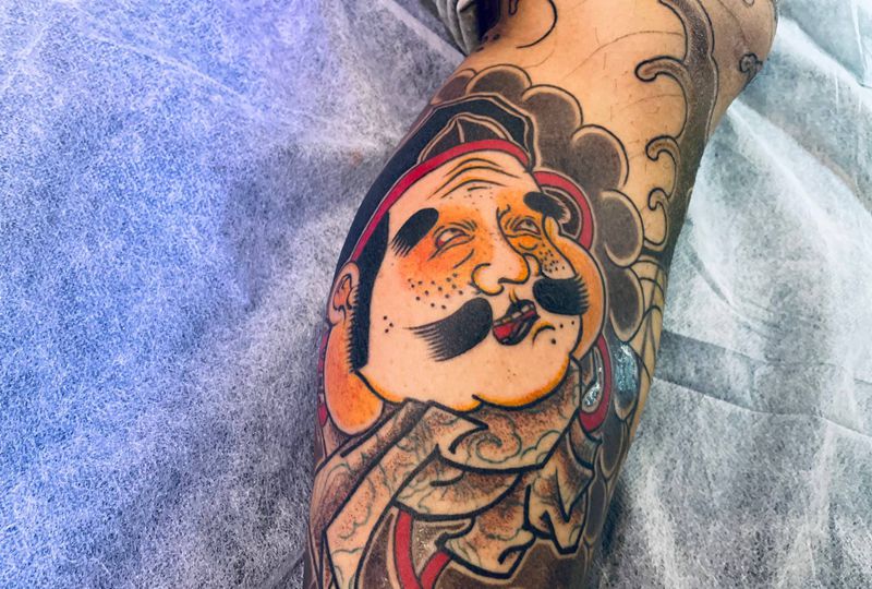 • T包小腿吹火男+阿多福纹身图片_腿部老传统新传统吹火男阿