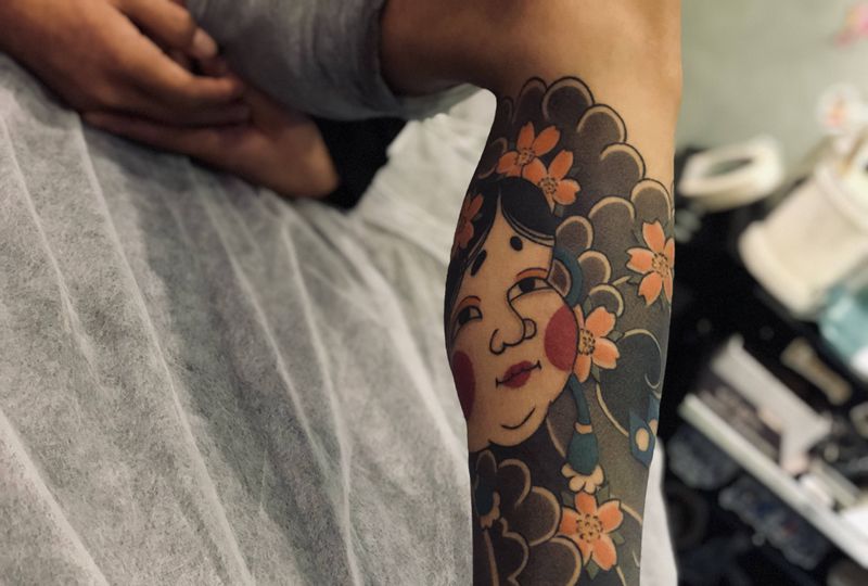 • T包小腿吹火男+阿多福纹身图片_腿部老传统新传统吹火男阿