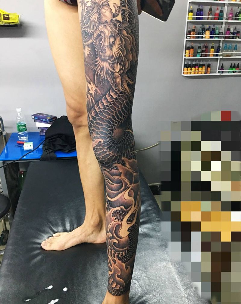 • T网红王老大花腿龙纹身图片_腿部新传统纹身图案