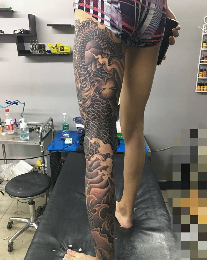 • T网红王老大花腿龙纹身图片_腿部新传统纹身图案