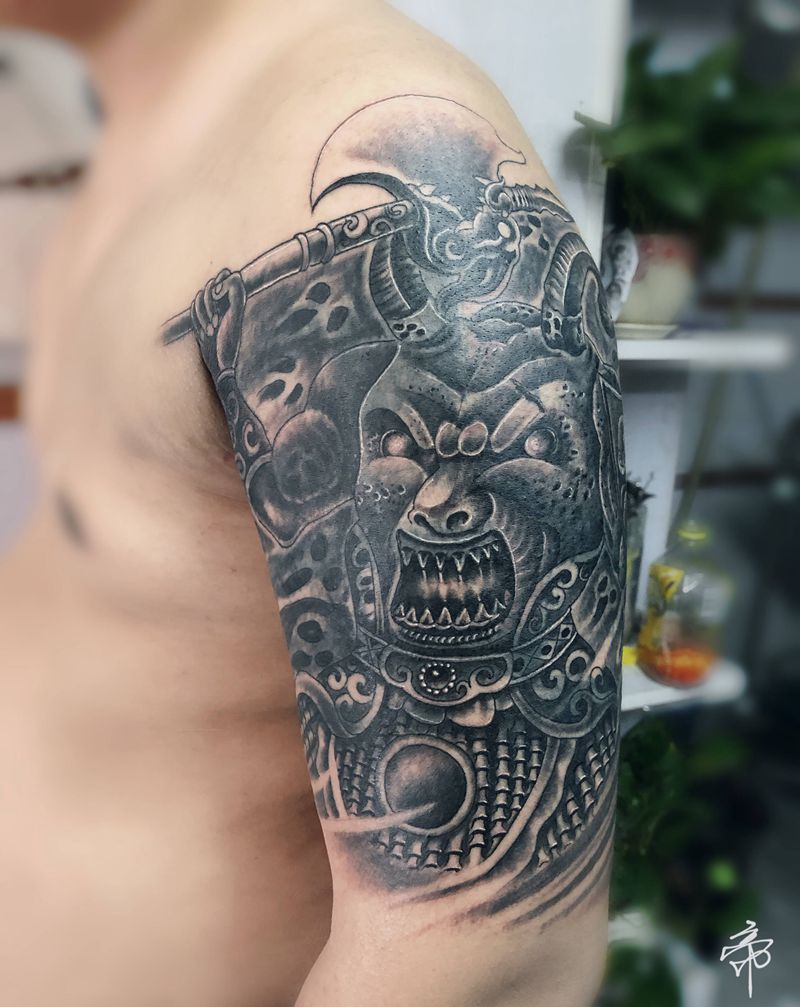 大臂刑天遮盖老纹身纹身图片_手臂纹身图案