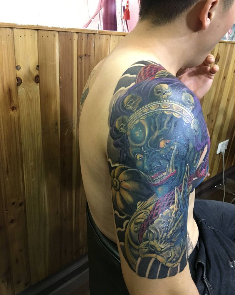 当前位置: 首页 >浙江省宁波市纹身店-帝玖刺青纹身图案>遮盖老式过肩龙纹身图片_胸部手臂新传统纹身图案