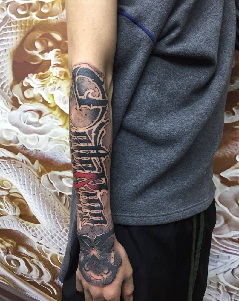 当前位置: 首页 >浙江省宁波市纹身店-帝玖刺青纹身图案>奇卡诺纹身图片_手臂花体字纹身图案