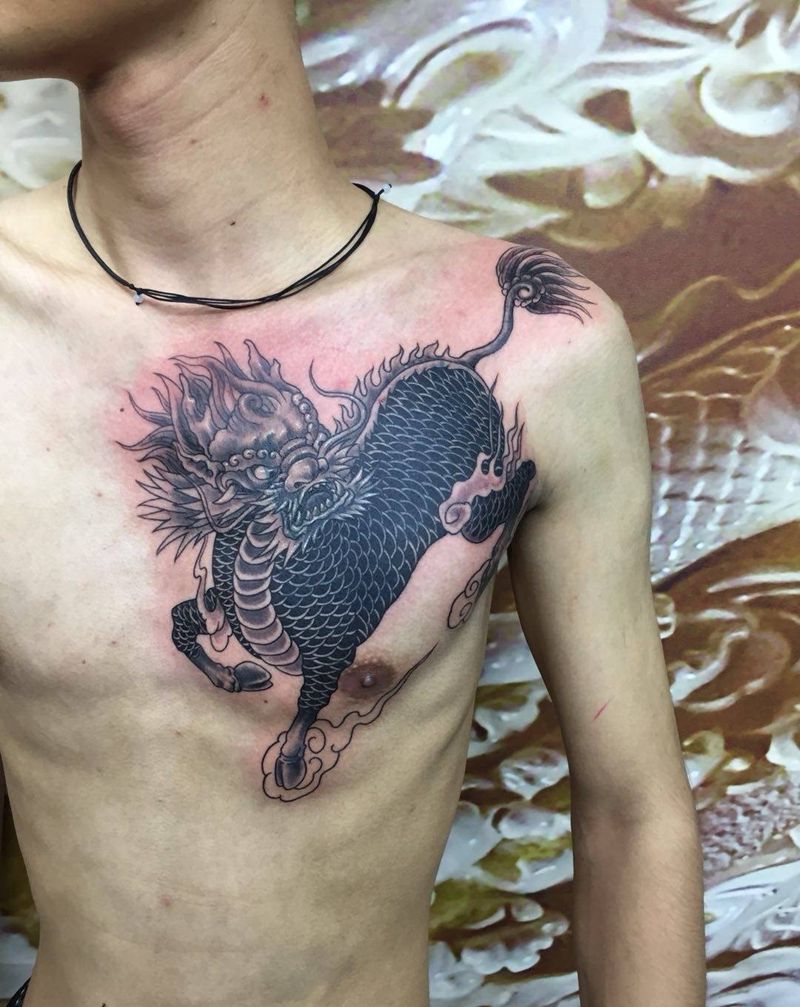 胸口麒麟遮盖纹身图片_胸部新传统纹身图案