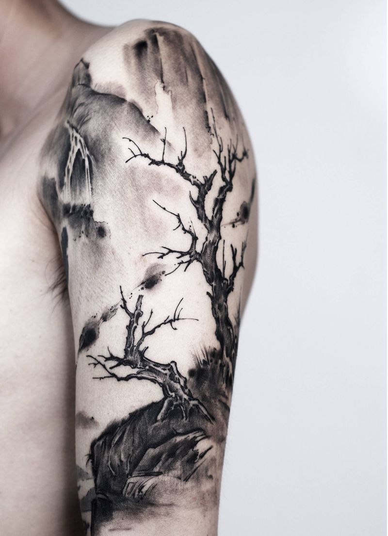 山水纹身图片_手部手臂水墨老传统山水树中国风纹身图案