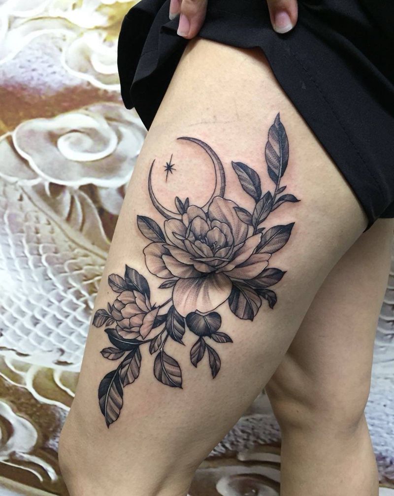 素花遮盖疤痕纹身图片_腿部新传统纹身图案