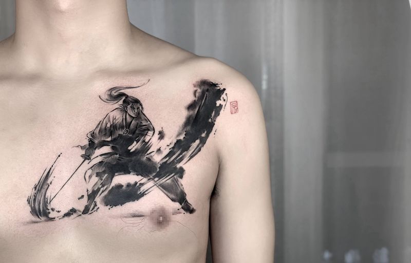 当前位置: 首页 >浙江省温州市纹身店-承影刺青纹身图案>武士纹身图片_胸部肩部水墨老传统纹身图案