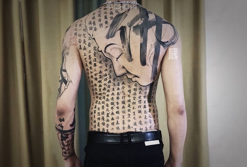 当前位置: 首页 >浙江省温州市纹身店-承影刺青纹身图案>佛语纹身图片_背部肩部水墨老传统佛像佛经大悲咒纹身图案