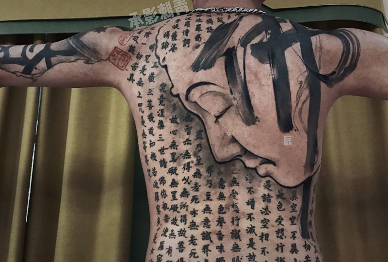 当前位置: 首页 >浙江省温州市纹身店-承影刺青纹身图案>佛语纹身图片_背部肩部水墨老传统佛像佛经大悲咒纹身图案