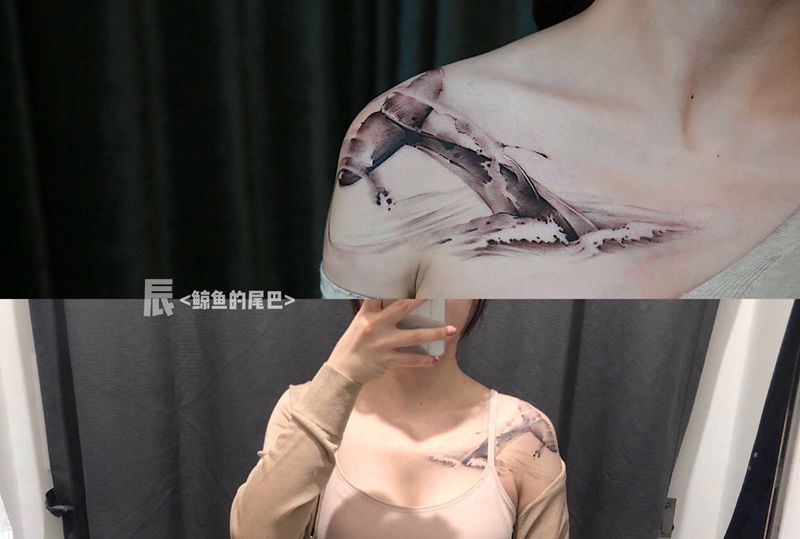 当前位置: 首页 >浙江省温州市纹身店-承影刺青纹身图案>鲸鱼的尾巴纹身图片_胸部肩部水墨欧美写实鲸鱼海豚鲨鱼纹身图案