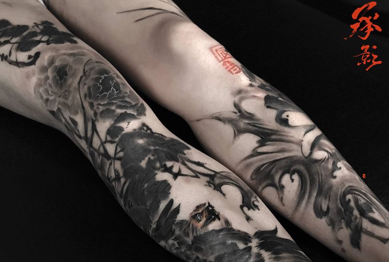 当前位置: 首页 >浙江省温州市纹身店-承影刺青纹身图案>新中式花腿纹身图片_腿部脚部水墨纹身图案