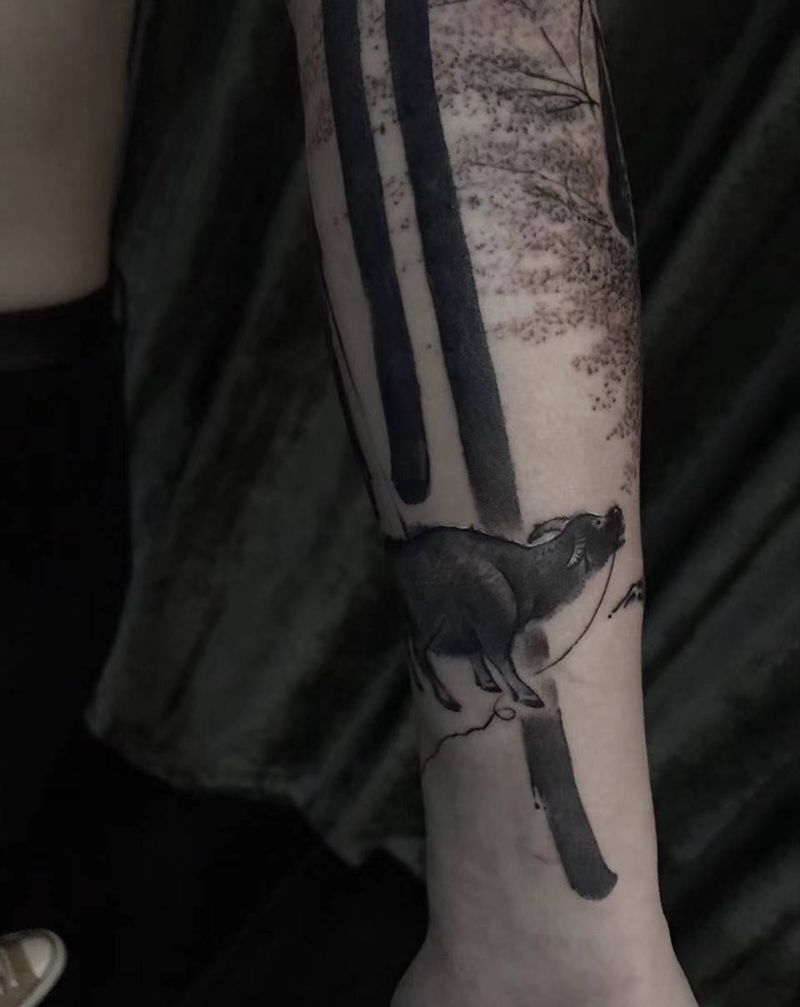 牛牛儿纹身图片_手臂手部老传统水墨纹身图案
