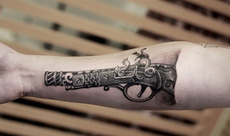 当前位置: 首页 >浙江省宁波市纹身店-百里刺青纹身图案>枪遮盖字母纹身图片_手臂纹身图案
