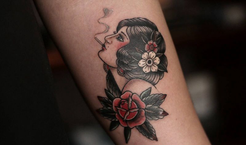 抽烟的女人纹身图片_手臂Old School纹身图案