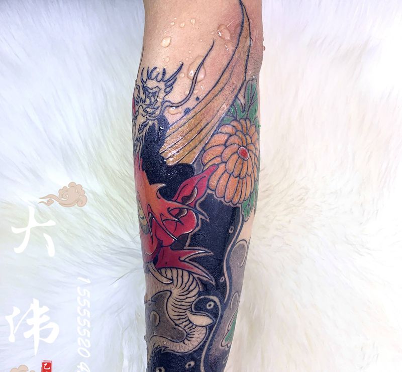 • T网红王老大花腿龙纹身图片_腿部新传统纹身图案