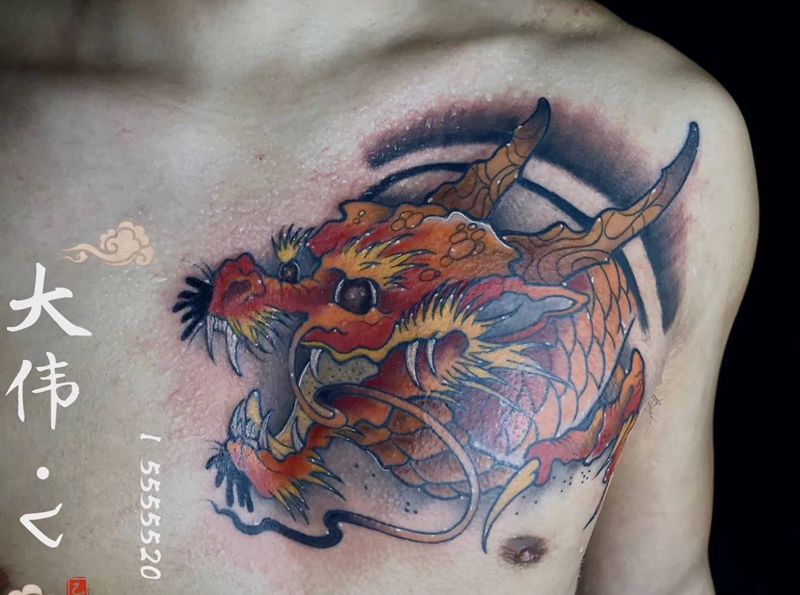 龙头纹身纹身图片_胸部新传统New School龙头纹身图案