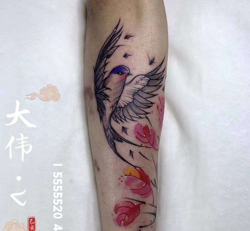 水墨与燕纹身图片_手臂水墨点刺燕花纹身图案