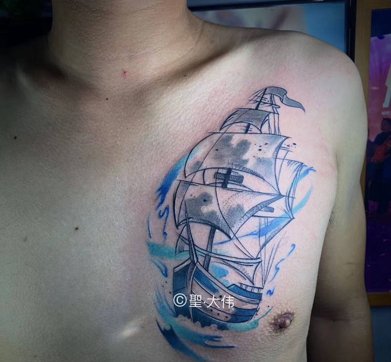 帆船纹身纹身图片_胸部水彩水墨船纹身图案