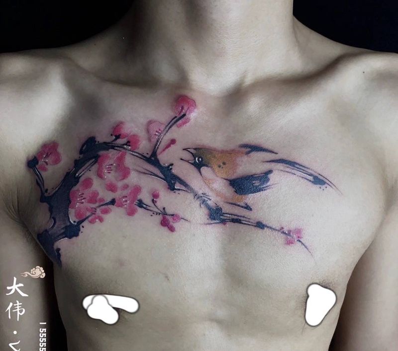 水墨中国风鸟纹身图片_胸部水墨水彩鸟纹身图案