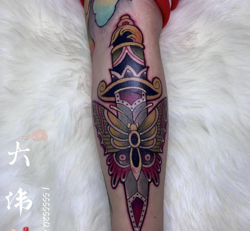 当前位置: 首页 >浙江省宁波市纹身店-初刺青工作室纹身图案>蝴蝶和刀纹身图片_手臂Old SchoolNew School纹身图案