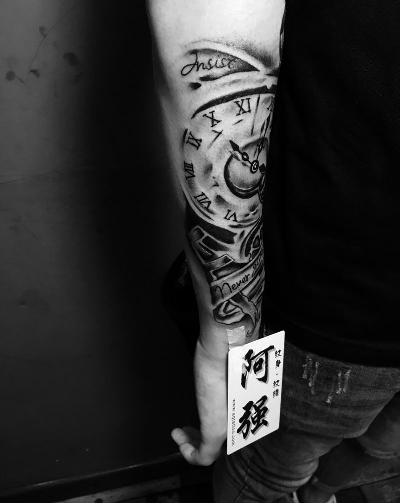 当前位置: 首页 >浙江省温州市纹身店-温州阿强纹身纹身图案>欧美黑白时钟纹身图片