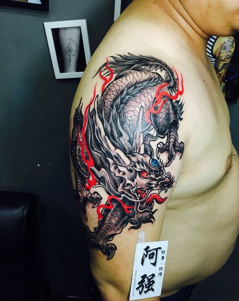 • T网红王老大花腿龙纹身图片_腿部新传统纹身图案