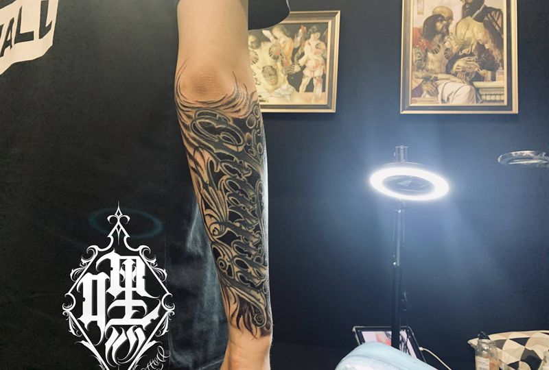 当前位置: 首页 >浙江省宁波市纹身店-嘿 刺青纹身图案>暗黑花体字纹身图片_手臂花体字暗黑纹身图案