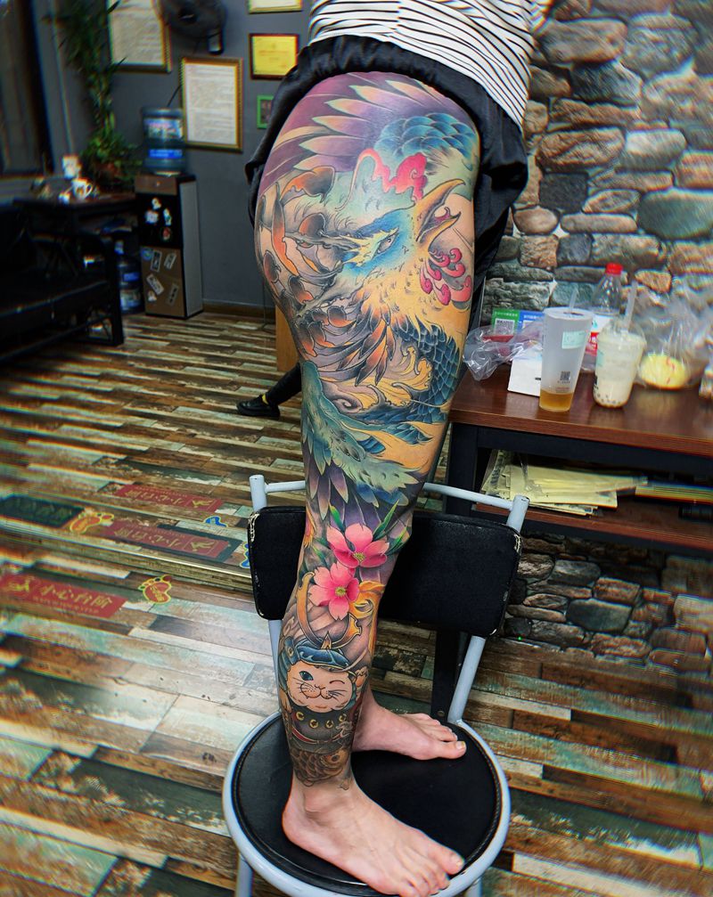 • T网红王老大花腿龙纹身图片_腿部新传统纹身图案