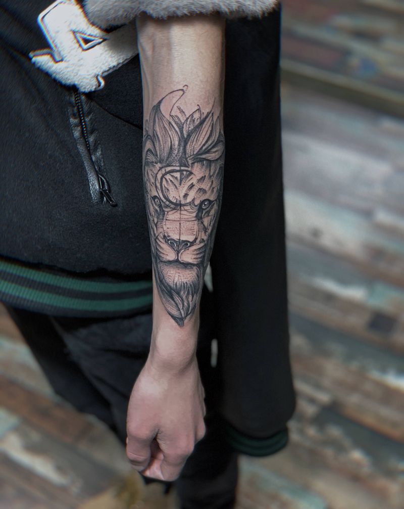 当前位置: 首页 >浙江省温州市纹身店-温州阿强纹身纹身图案>狮子纹身图片_手臂几何点刺纹身图案