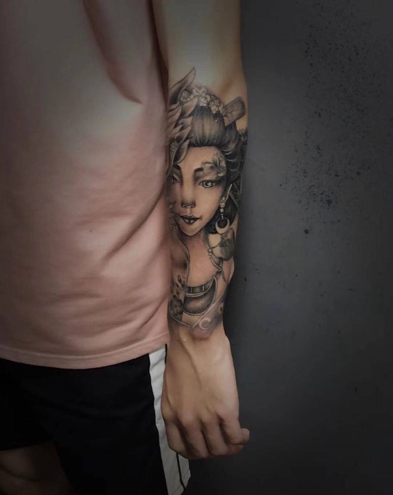 当前位置: 首页 >浙江省温州市纹身店-温州阿强纹身纹身图案>小臂艺妓纹身图片