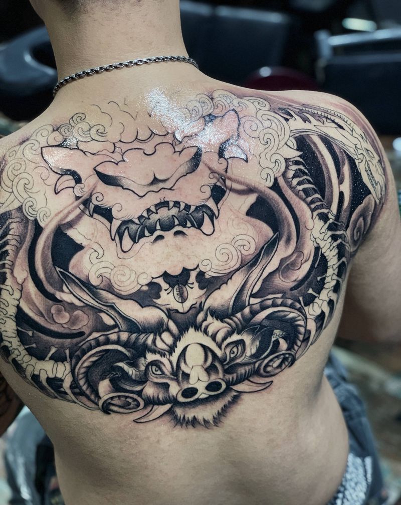 唐狮鹿头龙骨纹身图片_背部新传统水彩纹身图案
